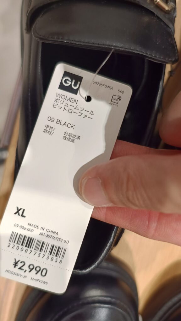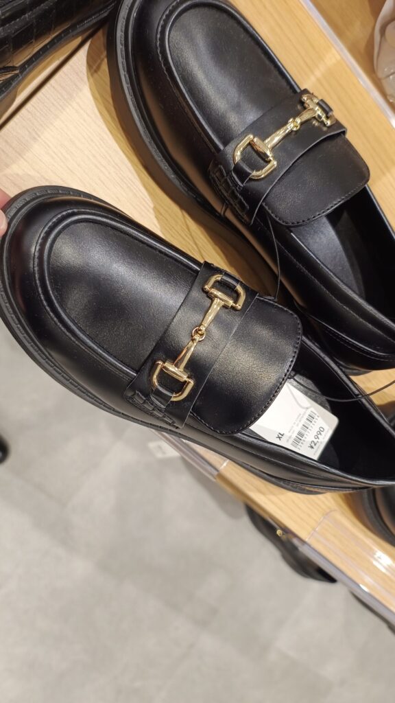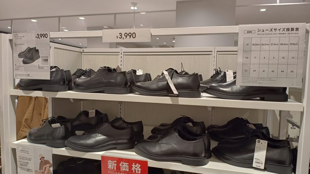 一時期話題になってた本革のダービーシューズはしっかり並んでますが、この日はローファーはありませんでしたね。公式サイトを見ると本革のローファーも一時期販売していたようですが定番品ではないようですね。残念。。。